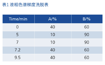 色譜柱:Quasar C18,100×2.1mm,3μm,貨號:N9308812(原文提及 “Supersil ODS2 2.1×100,3μm”,以實際檢測用 Quasar C18 柱為準(zhǔn));流動相:A 為 50% 甲醇水(含 0.5% 甲酸),B 為乙腈(含 0.5% 甲酸);柱溫:40℃;流速:0.5mL/min;進樣量:10μL;