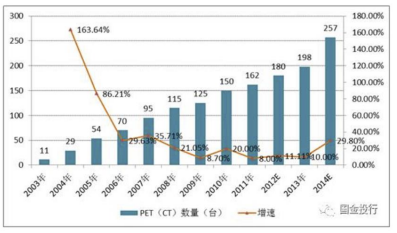 正是 PET-CT 在部分領(lǐng)域的獨(dú)特效用,國(guó)內(nèi)裝機(jī)數(shù)量不斷增長(zhǎng)。根據(jù)相關(guān)普查情況,自本世紀(jì)初西安萬(wàn)杰長(zhǎng)信醫(yī)院(現(xiàn)已更名 “長(zhǎng)安醫(yī)院”)購(gòu)買了中國(guó)大陸第一臺(tái) PET-CT 設(shè)備,中國(guó) PET-CT 的數(shù)量已經(jīng)增長(zhǎng)到 2014 年的 257 臺(tái),年均復(fù)合增長(zhǎng)率超過(guò) 30%。