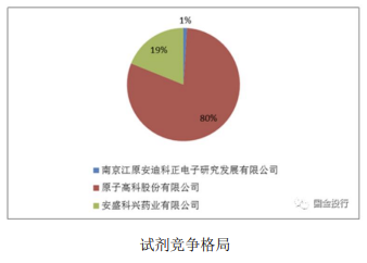 對(duì)我們來(lái)講,配套試劑 FDG 注射液的制備純化和純度分析需要用到液相色譜,而 FDG 注射液目前主要是國(guó)內(nèi)公司占據(jù)主要市場(chǎng)份額,PDB 數(shù)據(jù)庫(kù)顯示南京江原、原子高科、安盛科興基本占據(jù)全部市場(chǎng)。其中原子高科的市場(chǎng)占有率高,達(dá)到近 80%,主要?dú)w功于其市場(chǎng)布局較為完善,價(jià)格低于安盛科興。