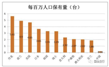 從保有量看,丹麥每百萬(wàn)人口 PET-CT 保有量高,達(dá)到 5.61 臺(tái) / 每百萬(wàn)人,相比之下中國(guó)只有 0.18 臺(tái) / 每百萬(wàn)人,排名靠前的 10 個(gè)國(guó)家中,少的芬蘭也有 1.86 臺(tái) / 每百萬(wàn)人,設(shè)備數(shù)量方面有 10 倍多的提升空間。