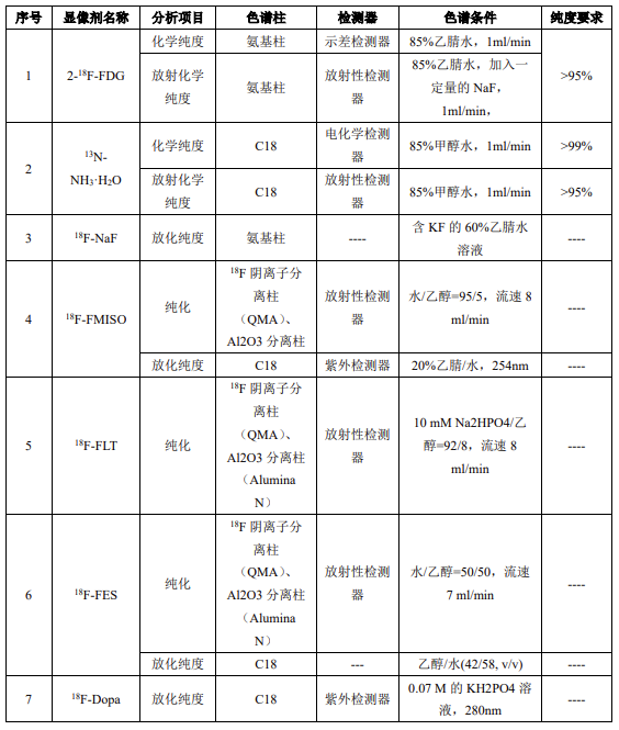\(^{18}\text{F}\)是載于美國(guó)藥典的第一個(gè) PET 放射性藥物,需要對(duì)放射性核純度、化學(xué)純度、放射化學(xué)純度、比活度等質(zhì)量指標(biāo)進(jìn)行控制,同時(shí)需要對(duì)合成反應(yīng)的副產(chǎn)物含量進(jìn)行控制,而液相色譜法是進(jìn)行\(zhòng)(^{18}\text{F}\)-FDG 化學(xué)純度分析的好方法。