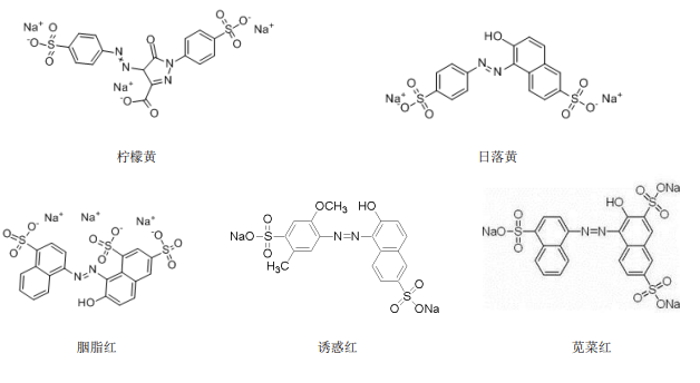 合成著色劑可分為偶氮類和非偶氮類兩種結(jié)構(gòu)。在酸堿條件下,兩種結(jié)構(gòu)的合成著色劑均穩(wěn)定。按著色劑的溶解性可分為脂溶性著色劑和水溶性著色劑,脂溶性著色劑由于不溶于水,在體內(nèi)不易排出,毒性較大等原因,在食品行業(yè)已經(jīng)不允許添加,現(xiàn)在世界各國(guó)使用的合成著色劑大部分為水溶性偶氮類著色劑。