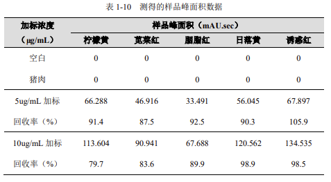 采用方法中描述的前處理過程,對(duì)空白、豬肉樣品以及加標(biāo)樣品進(jìn)行處理后,采集數(shù)據(jù),并計(jì)算所對(duì)應(yīng)的加標(biāo)回收率結(jié)果見表 1-10。