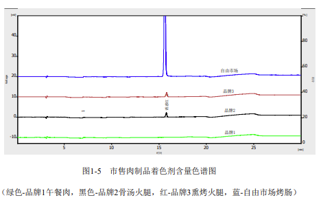 按照上述方法對(duì)市場(chǎng)上的幾種肉制品中著色劑的含量情況分析結(jié)果如下: