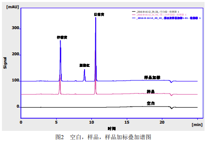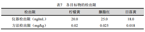 本系統(tǒng)的基線噪聲為25μV,根據(jù)3倍信噪比,儀器的小檢出限分別為檸檬黃20ng/mL,胭脂紅25ng/mL,日落黃18ng/mL。根據(jù)前處理方法計(jì)算,各目標(biāo)物的方法檢出限分別為檸檬黃20μg/kg,胭脂紅25μg/kg,日落黃18μg/kg,參見(jiàn)表7。