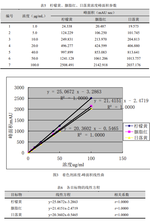 分別移取不同體積的標(biāo)準(zhǔn)儲(chǔ)備液,配制濃度為 1μg/mL、5μg/mL、10μg/mL、20μg/mL、40μg/mL、50μg/mL、100μg/mL 的標(biāo)準(zhǔn)混合工作液,按濃度由低至高進(jìn)樣分析,以濃度為橫坐標(biāo)、峰面積為縱坐標(biāo)繪制校準(zhǔn)曲線,檸檬黃、胭脂紅、日落黃的線性相關(guān)性結(jié)果如下: