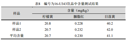 按照上述方法分析中國(guó)檢驗(yàn)檢疫科學(xué)研究院測(cè)試評(píng)價(jià)中心提供的飲品(樣品編號(hào)16-U343),測(cè)試含量結(jié)果見(jiàn)表8。