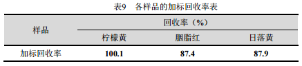 樣品中加入濃度為50μg/mL的混標(biāo)溶液1mL,經(jīng)過(guò)處理后分析,得到的各樣品的加標(biāo)回收率見(jiàn)表9。