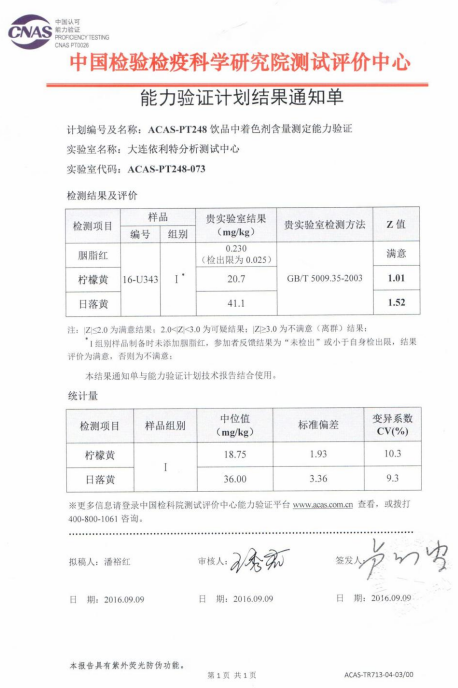 采用大連依利特公司 iChrom 5100 高效液相色譜儀,參考 GB/T 21916-2008《水果罐頭中合成著色劑的測(cè)定 高效液相色譜法》及 GB/T 5009.35-2003《食品中合成著色劑的測(cè)定》并優(yōu)化實(shí)驗(yàn)條件后,對(duì)中國(guó)能力驗(yàn)證中心提供的樣品進(jìn)行檢測(cè),結(jié)果如下:
