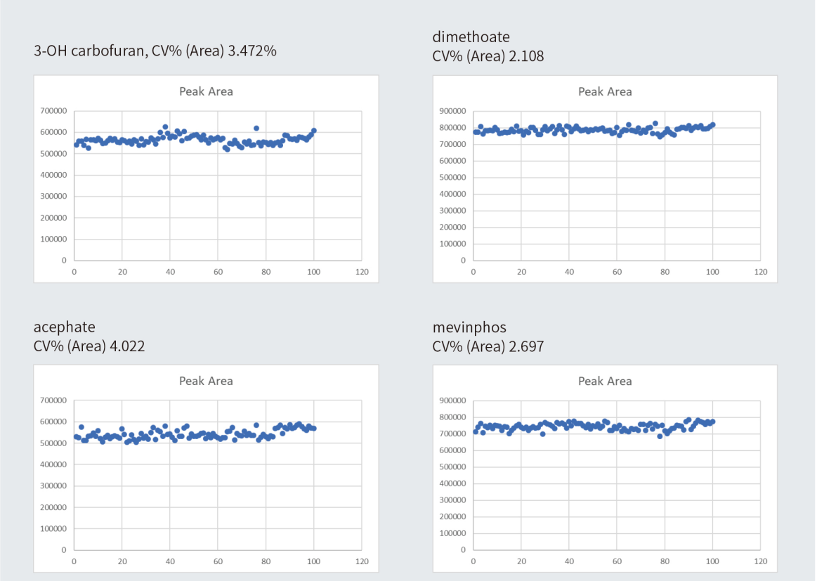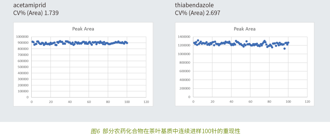 面對農(nóng)產(chǎn)品檢測越來越多樣和復雜的檢測樣品,三重四極桿質(zhì)譜的穩(wěn)定性和抗污染能力對于儀器的使用和維護來說也是非常重要的內(nèi)容。以待測樣品中常見而且非常復雜的茶葉基質(zhì)為例 (見圖 5),基質(zhì)加標濃度 20ng/mL 連續(xù)進樣 100 針,測試 MS2 Vertical9100 的耐臟性能。圖 6 展示了部分農(nóng)藥在 100 針進樣條件下峰面積重現(xiàn)性均小于 5% 的良好數(shù)據(jù)。Elite MS2 Vertical 9100 系列三重四極桿質(zhì)譜具有獨特的 "不怕臟、臟不怕、怕不臟" 的硬件設計:1. 帶有反吹干燥氣的雙錐孔質(zhì)譜接口結合離子源主動排放廢氣泵設計,具有優(yōu)異的抗污染能力,長時間無需維護離子源;2.HSID 熱表面誘導去溶劑質(zhì)譜接口技術,320° 加熱的質(zhì)譜接口使得儀器有效防止樣品中的復雜基質(zhì)污染儀器,長時間運行免于頻繁維護;3. 層流氣離子導向技術,提高離子傳輸效率避免頻繁的儀器調(diào)諧。優(yōu)異的耐臟基質(zhì)和污染物的硬件設計,保證滿足檢測靈敏度要求的同時,大程度使得儀器免于頻繁停機清洗和維護,大大提高了儀器的利用效率。