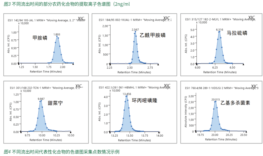本方法采用一針進(jìn)樣,通過(guò)Time Managed MRM正負(fù)切換模式同時(shí)測(cè)定331種化合物及其45種代謝物,共375個(gè)化合物,其中365種化合物采用正離子模式采集,10種化合物采用負(fù)離子模式采集。圖1中展示了375種化合物的提取離子疊加譜圖,圖2中是單獨(dú)10個(gè)負(fù)離子化合物的提取離子色譜圖。經(jīng)過(guò)優(yōu)化色譜洗脫條件,圖3展示了不同保留時(shí)間的部分農(nóng)藥化合物的提取離子色譜圖。各個(gè)化合物峰型對(duì)稱,軟件中TimedMRM功能目動(dòng)完成375個(gè)化合物的軒留時(shí)間分配,保讓每個(gè)色語(yǔ)峰上有足夠的來(lái)集點(diǎn)教,以使獲得準(zhǔn)確的結(jié)果為優(yōu)異的重復(fù)性,不同流出時(shí)間的代表性化合物的色譜圖采集點(diǎn)數(shù)情況示例詳見(jiàn)圖4。