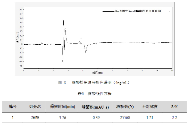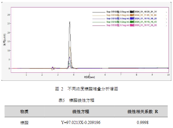 將糠醛標(biāo)準(zhǔn)工作溶液,按 2.2 中色譜條件進(jìn)行分析,糠醛的線性如下表所示: