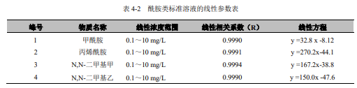 分別移取 0.10mL、2.50mL、5.00mL、8.00mL、10.00mL 酰胺類化合物標(biāo)準(zhǔn)使用液置于一組 50mL 容量瓶中,用水定容至標(biāo)線,搖勻。由低濃度到高濃度依次移取 5.0μL 注入液相色譜儀,按照液相色譜參考條件進(jìn)行分析測定。以標(biāo)準(zhǔn)系列溶液中目標(biāo)化合物的濃度 (mg/L) 為橫坐標(biāo),以峰高或峰面積為縱坐標(biāo),建立酰胺類化合物標(biāo)準(zhǔn)曲線。
