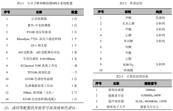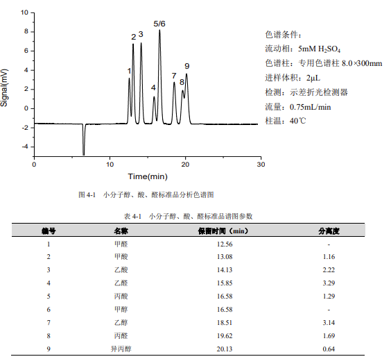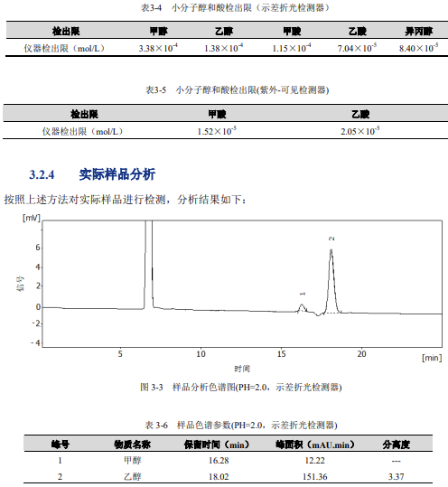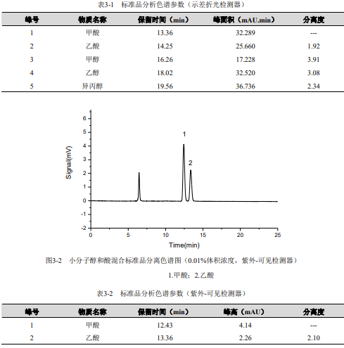 儀器設(shè)備與試劑示差折光檢測器為通用型檢測器,可以對所有小分子醇和酸進行檢測,但其靈敏度較低,不能用于痕量檢測;紫外可見檢測器對絕大多數(shù)在紫外-可見光的波長范圍內(nèi)有特征吸收的物質(zhì)均有較高的檢測靈敏度;兩種檢測器的串聯(lián)使用,取長補短,即能實現(xiàn)總量分析,又能完成對甲酸、乙酸等具有代表性的物質(zhì)進行痕量分析的需求。