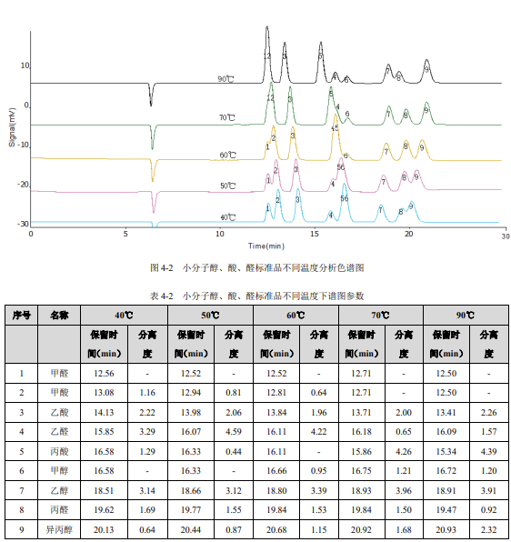 由以上結(jié)果可知,小分子醇、酸、醛的分離情況隨著溫度改變而改變,用戶可以根據(jù)自身檢測需求,選擇特定溫度進行實驗,從而達到測定某種或者某幾種小分子醇、酸、醛含量的目的。